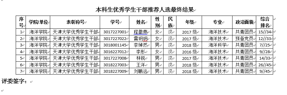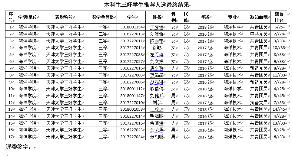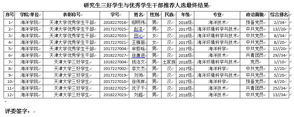 经过前期个人申请,根据集中展示答辩结果以及评委会会评审议等环节,现将第三批次奖励学金排名成绩公示如下:一、天津市人民政府奖学金评选推荐人选公示