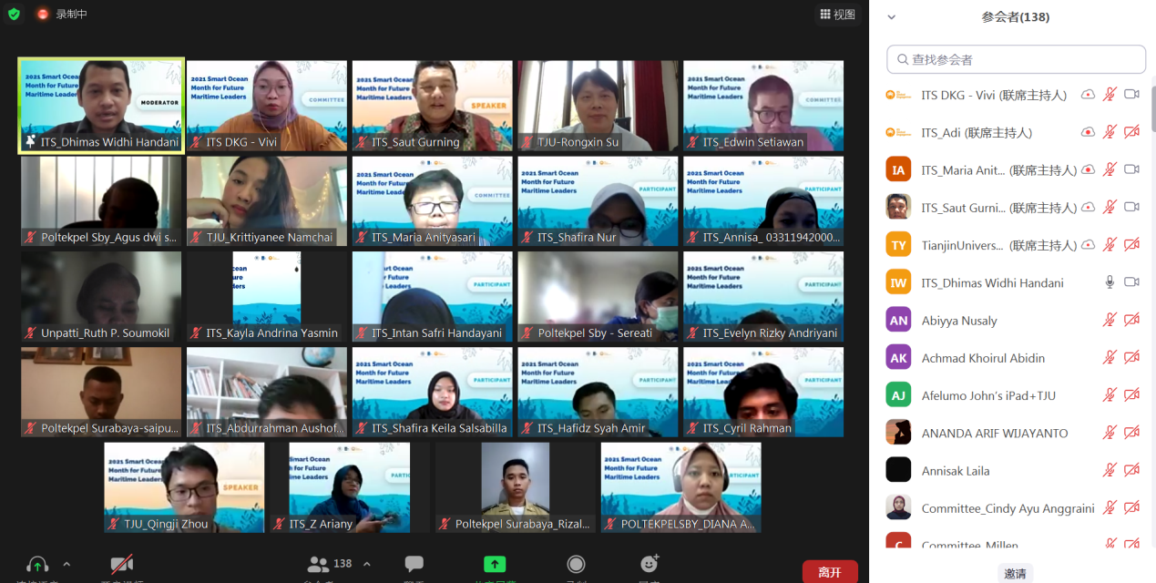 9月7日,“2021年智慧海洋月”系列线上讲座正式开幕。印尼泗水理工188金宝博 科研副校长Bambang Pramujati博士、188金宝博 188金宝博 副院长苏荣欣教授、印尼泗水理工188金宝博 国际合作处负责人Maria Anityasari博士,以及来自印尼、中国、孟加拉国、巴基斯坦、泰国、柬埔寨、马来西亚、尼日利亚、土库曼斯坦、也门等学生和科研人员近150人出席。