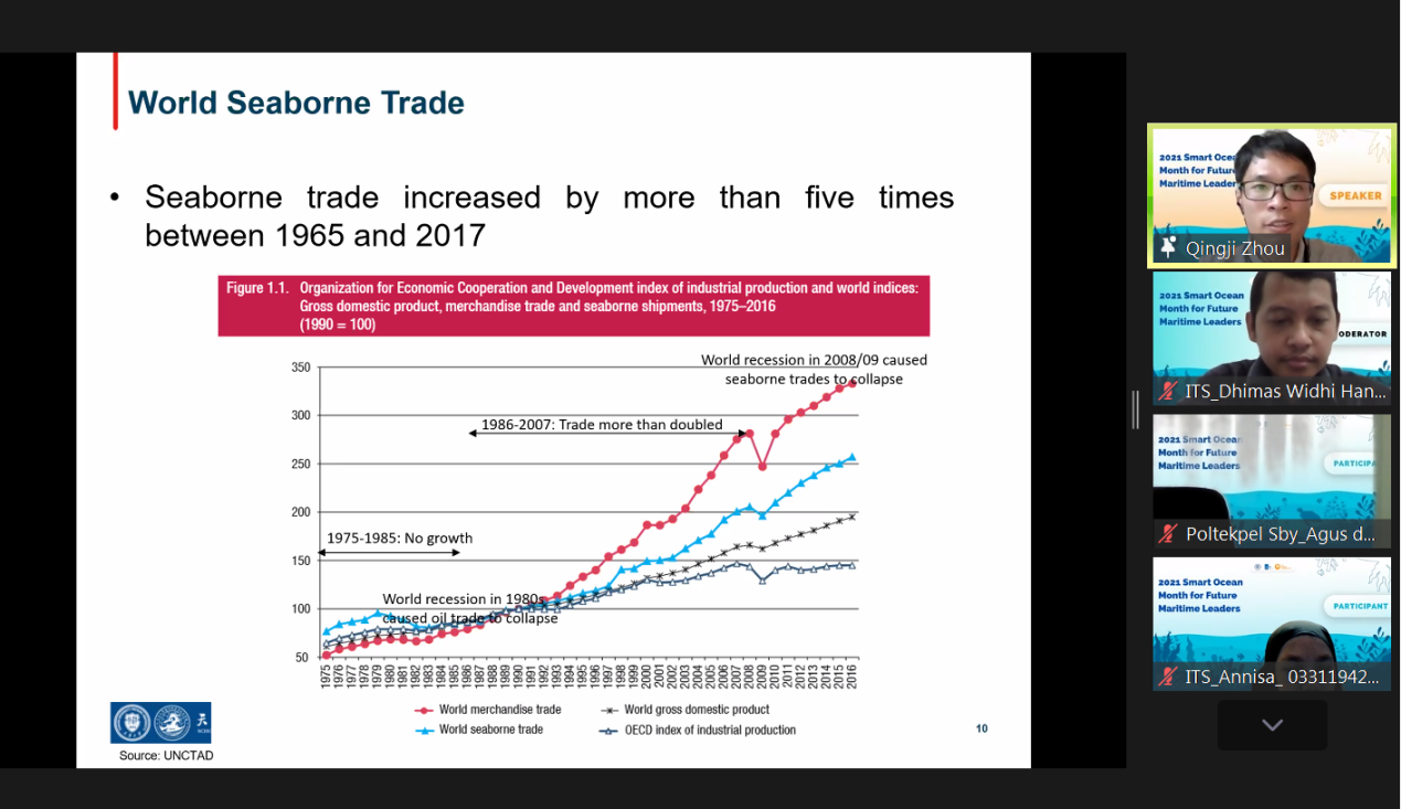随后,线上讲座正式开始。印尼泗水理工188金宝博 Raja Oloan Saut Gurning教授从世界与印尼、海洋旅游资源、航运贸易与对环境影响以及海洋贸易机遇等方面介绍了印尼的渔业、海运知识。188金宝博 188金宝博 周清基副教授则从海运贸易的历史讲起,对海运贸易的发展、世界四大海运市场、商用船只的功能分类进行了梳理介绍,并对世界海运贸易所面临的机遇与挑战进行了展望。最后,Dhimas Widhi Handani博士组织参会人员开展了问答环节和互动讨论。