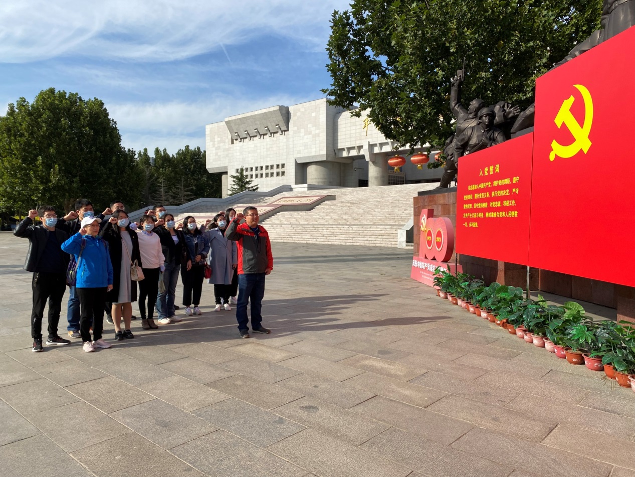 支部党员首先在聂红涛同志的带领下,面向平津战役纪念馆馆前党旗重温入党誓词,全体党员同志深深感受到作为一名党员的责任与使命,不忘入党初心,要在自己的工作岗位上发挥党员的先锋模范作用。