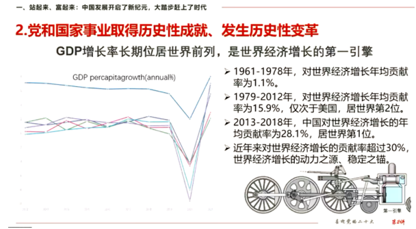 接下来单小麟详细讲述了自十八大以来,党和国家事业所取得的历史性成就、发生的历史性变革,他语重心长地说:“要坚定不移地坚持党的全面领导、不断完善党的领导机制体制,使全党在思想上保持高度统一,有力保证党中央权威和集中统一领导”。在经济建设上,我国经济总量不断迈上新台阶,经济发展也实现了由高速增长到高质量发展的转变,过去十年里,我国对世界经济增长的贡献率名列前茅,是推动世界经济增长的决定性力量。单小麟还提到,在社会建设层面,中国同样取得了举世瞩目的伟大成就:脱贫攻坚战的胜利,标志着中国已全面实现减贫目标,完成了消除绝对贫困的艰巨任务,创造了人类历史发展的奇迹;义务教育的巩固普及,让越来越多的青年能够享受到公平的教育机会,为实现人生价值提供更多途径;新冠肺炎疫情的精准防控,是党坚持人民至上、生命至上的体现,最大程度地保障了人民群众的生命安全和身体健康。社会建设的成就,使人民的幸福感、安全感更有保障,人民对美好生活的向往和期待也不断增加。可以说,中华民族迎来了从富起来到强起来的巨大飞跃。