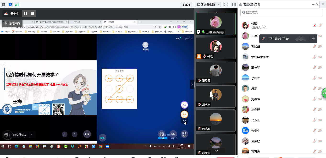 王梅老师以学习通教学平台为基础,以所授通识课《探寻数据之美》做贯穿,围绕课前,课中,课后三个主要环节的教学内容构建流程展开:课前应以教学门户的功能展现教学安排及课前须知,做好学情分析,使学生深入了解课程情况;课中结合智慧教学工具,利用分屏签到、抢答、开展主题讨论、生成词云等功能模块,抓取学生核心点,有效调节课程节奏,及时捕捉学生学习进度,动态掌握学生学习情况,做到因材施教;课后利用各类线上工具布置趣味性作业,持续提供课程资源及参考资料,根据学生需求开展主题性加餐课程,保持师生沟通。