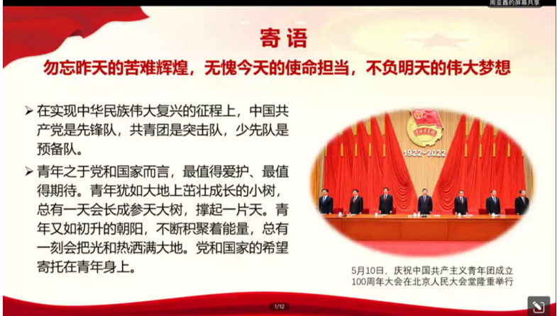 诚如习近平总书记所言:勿忘昨天的苦难辉煌,无愧今天的使命担当,不负明天的伟大梦想。我辈青年站在民族复兴的时代前沿,是党和国家的未来希望,定要不负总书记的殷切期望,在实干中发挥人生价值、实现人生理想,以最饱满的精神、最昂扬的斗志迎接党的二十大胜利召开!
