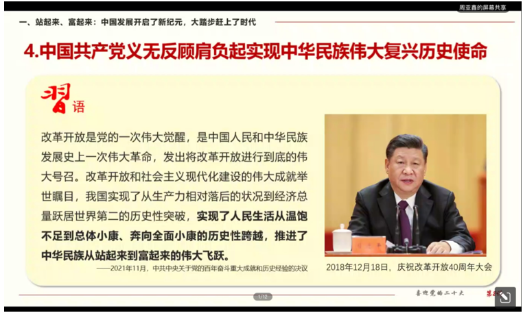 接下来单小麟详细讲述了自十八大以来,党和国家事业所取得的历史性成就、发生的历史性变革,他语重心长地说:“要坚定不移地坚持党的全面领导、不断完善党的领导机制体制,使全党在思想上保持高度统一,有力保证党中央权威和集中统一领导”。在经济建设上,我国经济总量不断迈上新台阶,经济发展也实现了由高速增长到高质量发展的转变,过去十年里,我国对世界经济增长的贡献率名列前茅,是推动世界经济增长的决定性力量。单小麟还提到,在社会建设层面,中国同样取得了举世瞩目的伟大成就:脱贫攻坚战的胜利,标志着中国已全面实现减贫目标,完成了消除绝对贫困的艰巨任务,创造了人类历史发展的奇迹;义务教育的巩固普及,让越来越多的青年能够享受到公平的教育机会,为实现人生价值提供更多途径;新冠肺炎疫情的精准防控,是党坚持人民至上、生命至上的体现,最大程度地保障了人民群众的生命安全和身体健康。社会建设的成就,使人民的幸福感、安全感更有保障,人民对美好生活的向往和期待也不断增加。可以说,中华民族迎来了从富起来到强起来的巨大飞跃。