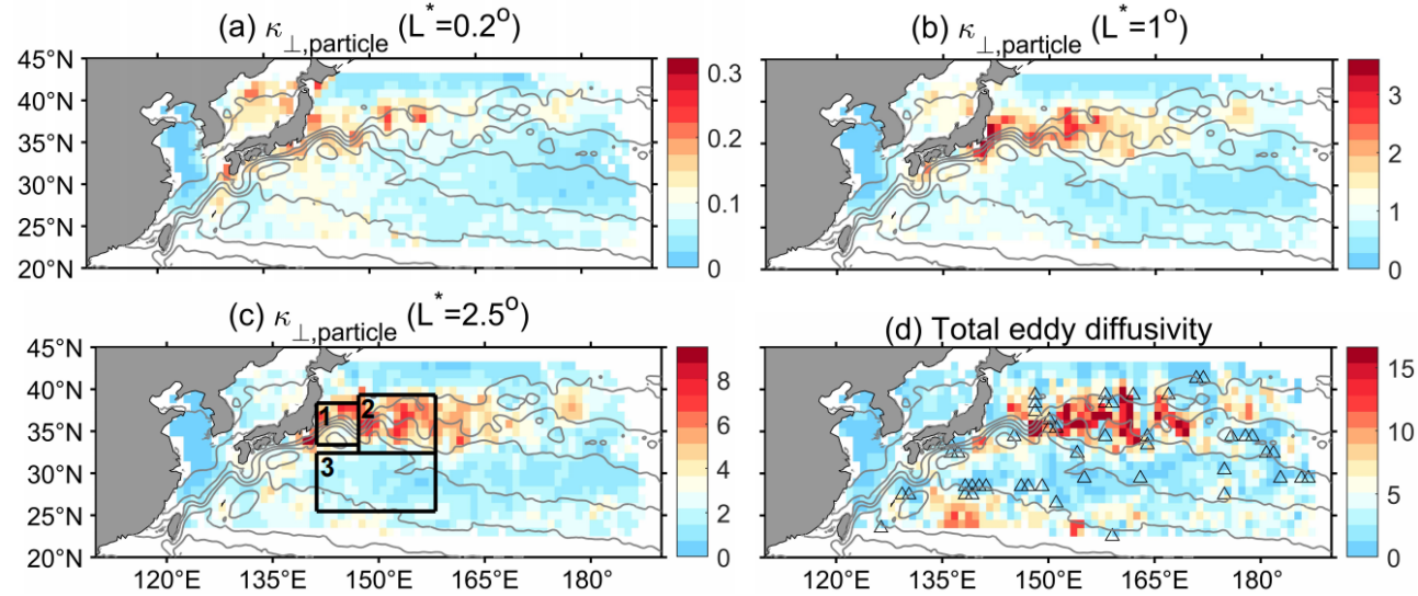 图2特定尺度年平均跨流涡旋扩散系数在黑潮延伸体区域的空间分布(103m2s-1)。(a)滤波分离尺度L*=0.2°,(b)L*=1°,(c)L*=2.5°以及(d)总涡旋扩散系数。(c)中三个黑框分别代表急流上游(区域1)、下游(区域2)以及南侧(区域3)区域。三角符号代表负值。