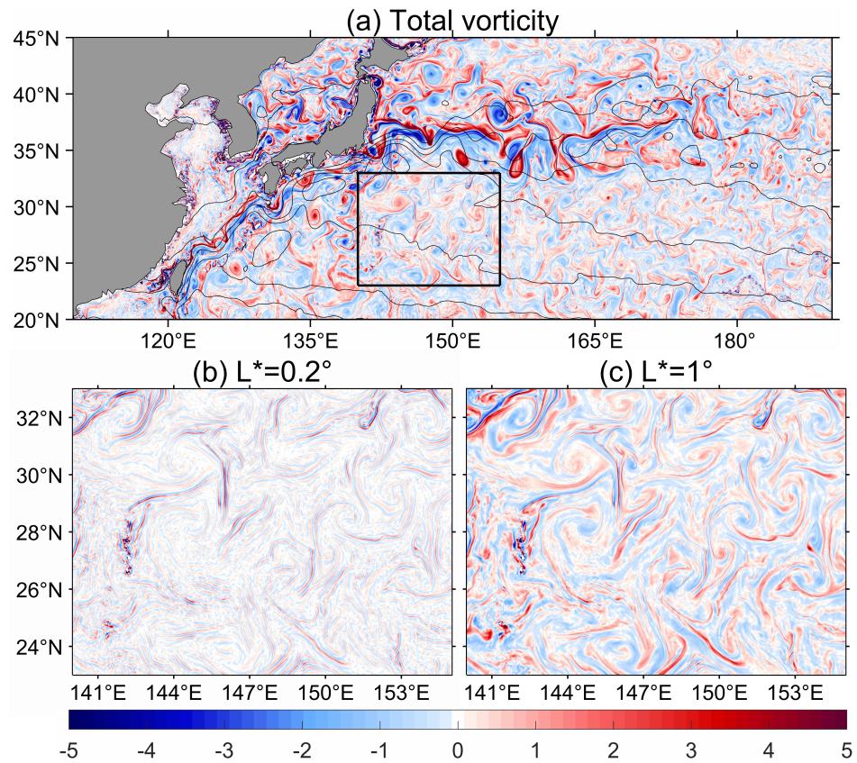 图1(a)黑潮延伸体区域总涡相对涡度(10-5s-1),以2011年9月13日为例。(b)是来自于(a)黑框中的特定尺度相对涡度,滤波分离尺度L*=0.2°。(c)与(b)相同,但是L*=1°。特定尺度涡度定义为空间尺度小于L*的涡旋引起的涡度,总涡度定义为所有涡旋引起的涡度。