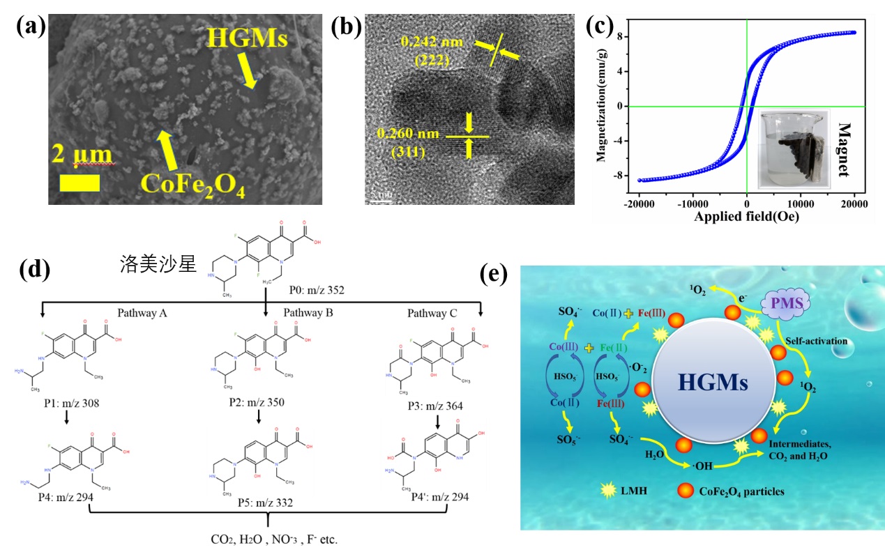 盐酸洛美沙星(LMH)是一种广泛应用于抗感染的氟喹诺酮类抗生素。作为一种新兴水体污染物,其化学性质稳定不易分解,当进入水环境将对生态系统构成潜在威胁。近年,基于磁性CoFe2O4活化过硫酸盐(PMS)产生高活性氧化物种的环境催化技术得到了持续关注和广泛研究。然而,CoFe2O4活化PMS过程产生的大量H+腐蚀CoFe2O4晶格结构导致钴和铁离子溶出,降低催化活性并带来重金属污染风险。另一方面,粉末态CoFe2O4因其表面能较高,在合成过程中不可避免地出现团聚效应,且催化反应后固液磁分离过程依然无法解决催化剂组分流失难题。因此,降低催化过程CoFe2O4金属离子溶出,改善CoFe2O4回收便利性,避免团聚失活等问题的协同解决是CoFe2O4基非均相芬顿催化剂走向大规模应用的关键。