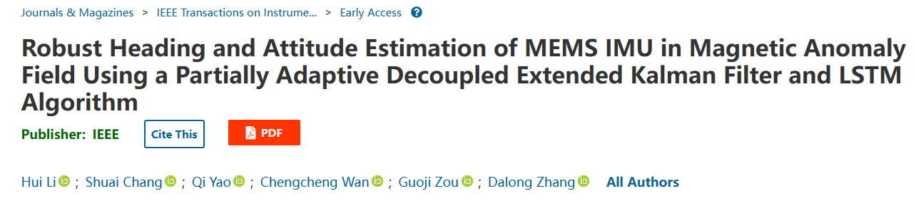 近日,188金宝博 海洋通信与导航技术课题组在水下航行器位姿鲁棒估计方面取得重要进展,相关研究论文“Robust Heading and Attitude Estimation of MEMS IMU in Magnetic Anomaly Field Using a Partially Adaptive Decoupled Extended Kalman Filter and LSTM Algorithm”在国际高水平期刊《IEEE Transactions on Instrumentation and Measurement》发表(中科院二区TOP,IF 5.6)。论文第一作者为2021级海洋技术专业研究生李慧,通讯作者为常帅副教授。