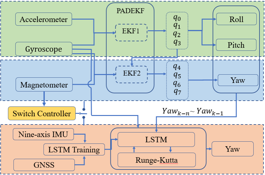 针对此问题,研究者从两个角度开展了磁异常干扰环境下的MEMS IMU鲁棒航向姿态解析方法。针对较为稳定且强度适中的磁异常干扰,设计了基于双四元数部分自适应扩展卡尔曼滤波(PADEKF),实现航向与姿态的分步解耦解析;准确跟踪干扰噪声以保证航向解算的精度,同时能够避免对姿态估计的影响。而针对与地磁场强度同量级的强度较大且变化复杂的干扰,提出了长短期记忆神经网络(LSTM)与龙格库塔方法的组合算法来提高航行器航向的长时准确解算能力。 该研究对提升自主航行器在特殊干扰环境下的自主导航能力来说是一种重要的新型方法支撑。