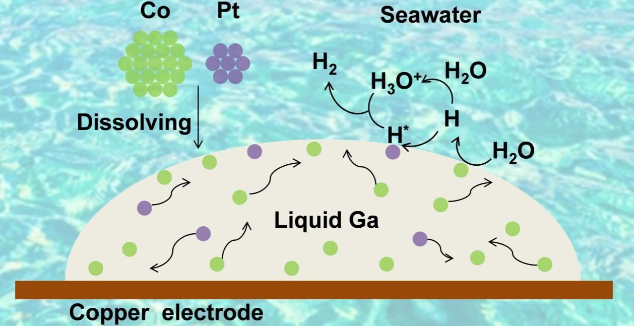 图1镓基液态金属促进Co、Pt双金属协同催化海水直接电解制氢原理示意图