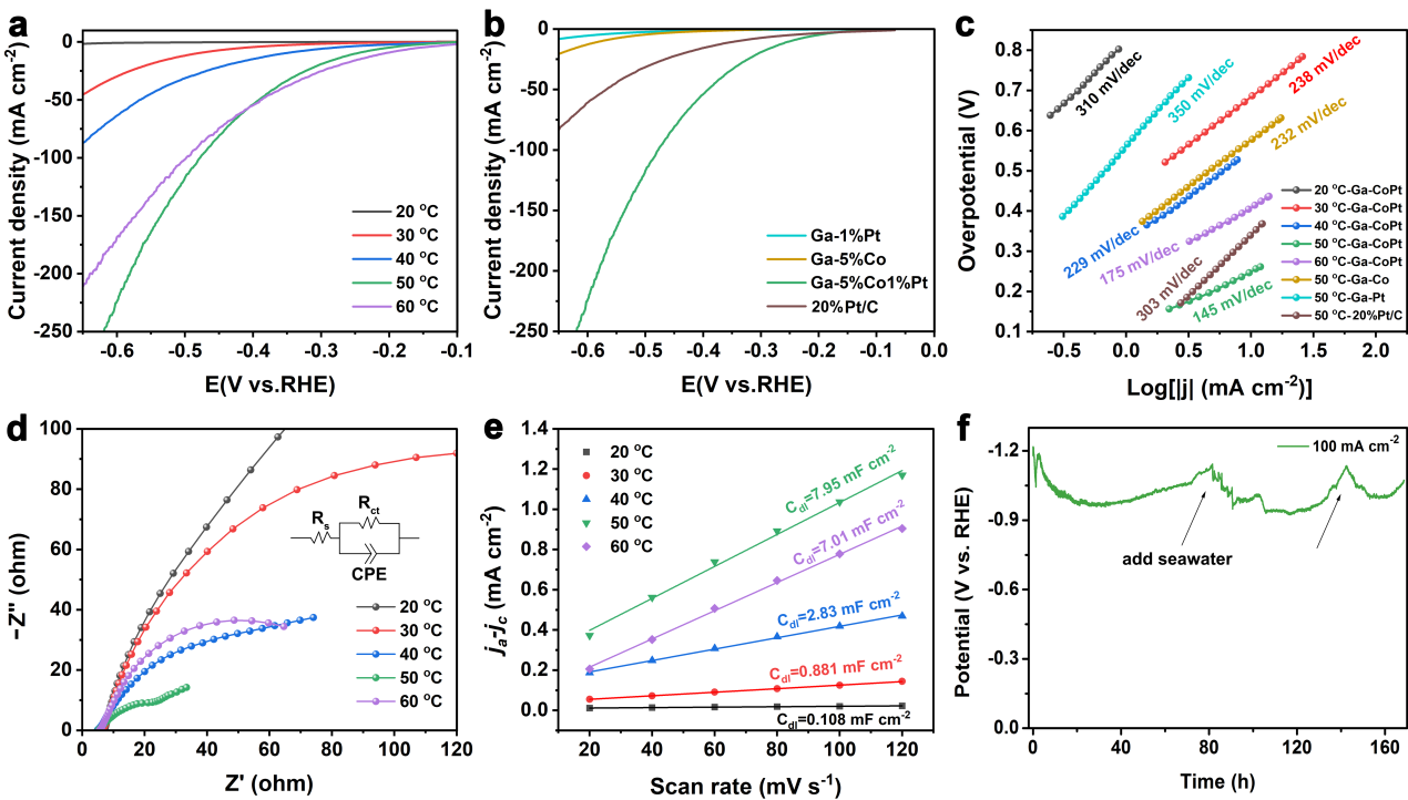 本工作设计制备高性能液态金属基电催化剂Ga-CoPt用于海水直接电解制氢,揭示了镓基液态金属对活性金属的分散和协同作用,发展并推广镓基液态金属的催化应用研究,为海水直接电解制氢催化剂的设计制备和工艺开发,提供新的思路。