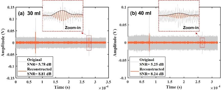 图4不同浑浊度水体的原始和重建双光梳干涉图,自来水中加入(a)30 ml和(b)40ml牛奶后的双光梳信号。