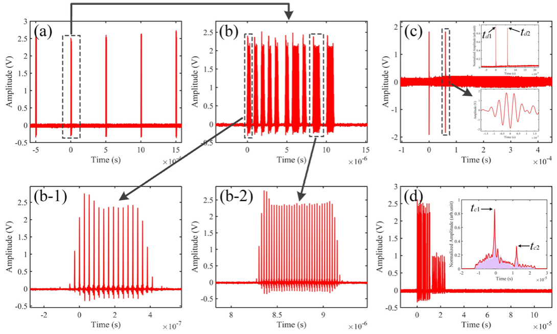 图2基于频率梳的脉冲编码信号和实验结果得到初始位置点结果;(a)光脉冲编码,(b)光脉冲编码信号的部分放大细节;(b-1)单比特编码{1}的局部放大细节;(b-2){1,1}编码的部分放大细节;(c)水下初始位置点测量结果;(d)初始位置点脉冲编码信号的测量结果。
