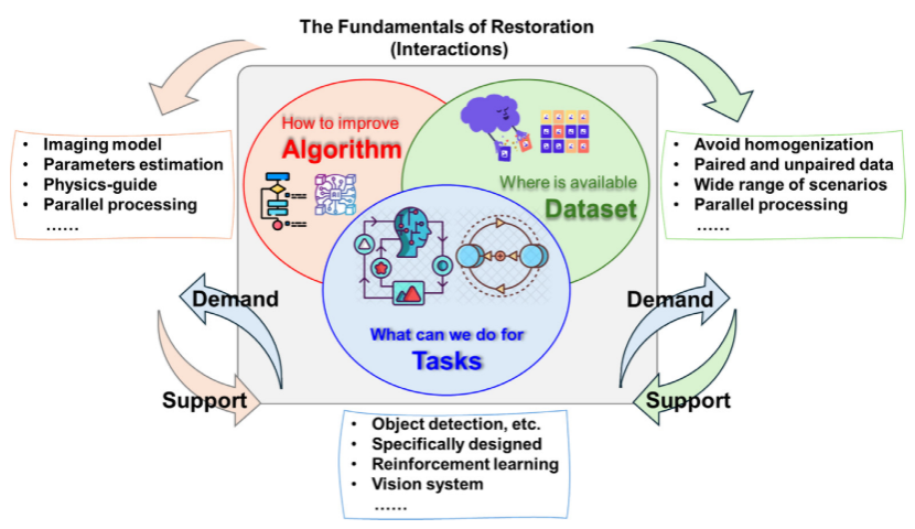 此外,文章围绕算法、数据集和任务三个方面提出了潜在的研究方向。特别是算法和数据构成了水下图像复原的基础,它们相互关联、相辅相成,共同支持后续任务。相反,实际任务需要数据和算法的改进,引导其向更复杂的方向前进,进一步提升水下光学成像技术的能力。