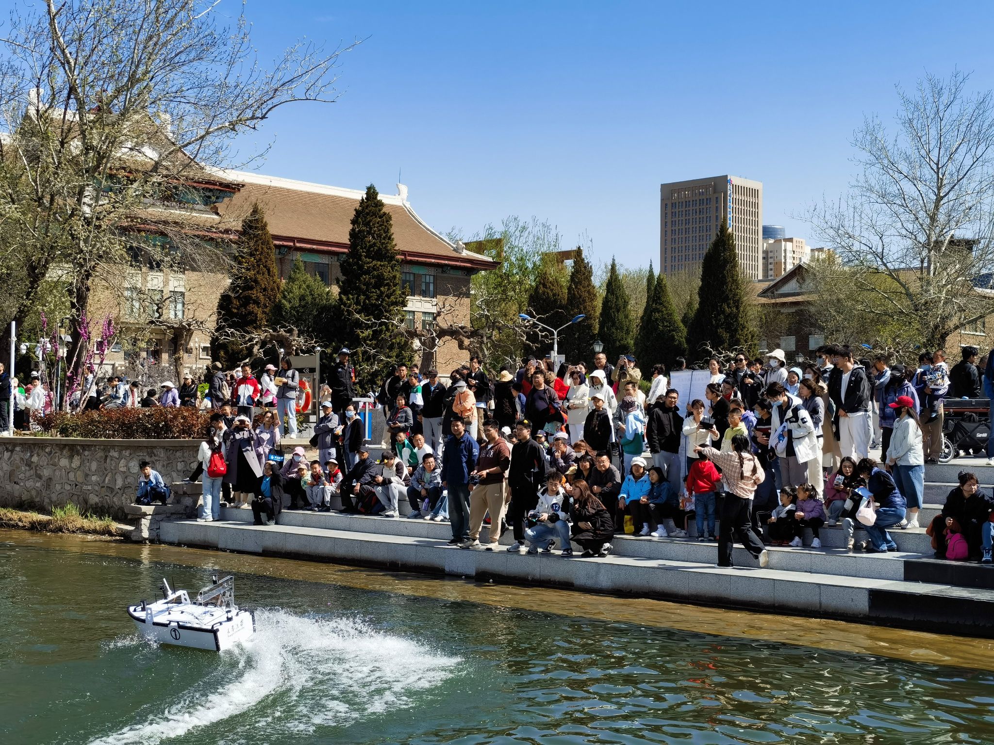 在湖光春色中,无人机展翅飞行翱翔,无人艇乘风破浪,划出一道优美的弧线,令来往游客叹为观止,纷纷驻足围观,感受海洋科学与技术的奇妙魅力。