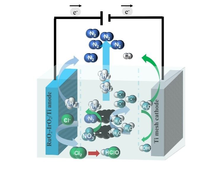 在海水水产养殖中,过高的氨氮浓度是导致水生生物发生急性中毒的主要原因,持续升高的氨氮浓度也会引发浮游植物过度生长,导致有害藻华的爆发、水质恶化。此外,水生生物长期暴露于高浓度硝酸盐、亚硝酸盐的环境中也会对其造成毒害作用。现有氨氮处理主要技术(物理化学法、生物法、折点氯化法等)不能真正实现氨氮的去除,仅仅是将氨氮转化为吸附态氨氮或硝酸盐并继续残留在水体当中,产生毒性危害鱼类生存。电化学氧化技术操作简便,污染物去除效率高,适应多变复杂的水体环境,但在实际氨氮的废水处理中,常常将氨氮过度氧化为硝酸盐和亚硝酸盐,导致有毒副产物积累。