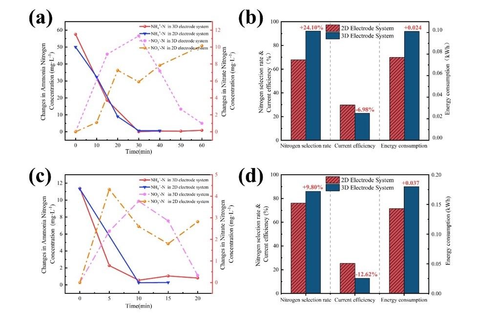 三维电极系统在海水养殖氨氮废水处理中无需额外添加试剂,仅靠海水固有 NaCl 和 H₂O 即可维持电极系统高效稳定运行。三维电极系统中,Ti/RuO2–IrO2 阳极氧化 Cl⁻ 产生活性氯(2Cl-→Cl2↑+2e-),SnO2–Sb2O3@GAC 颗粒电极的阳极区同步氧化生成 ·OH (2H₂O → H₂O₂/·OH + 2H⁺ + 2e-),二者协同将氨氮一步氧化为 N2 逸出,避免二次污染;颗粒阴极区并行高效还原硝酸盐(2NO₃⁻ + 12H⁺ + 10e- → N₂ + 6H₂O),实现氨氮直接转化为N2且不产生硝酸盐积累。相比于传统电化学氧化法,该三维电极系统将氮气选择率从67.90%提升至92.06%(图2),出水各项指标均达国家标准,同时将废水pH值稳定在弱碱性区间。该系统可原位运行,实现养殖水直接循环利用,为海洋养殖废水提供了一种无害化现场处理与资源回收的新技术范式。