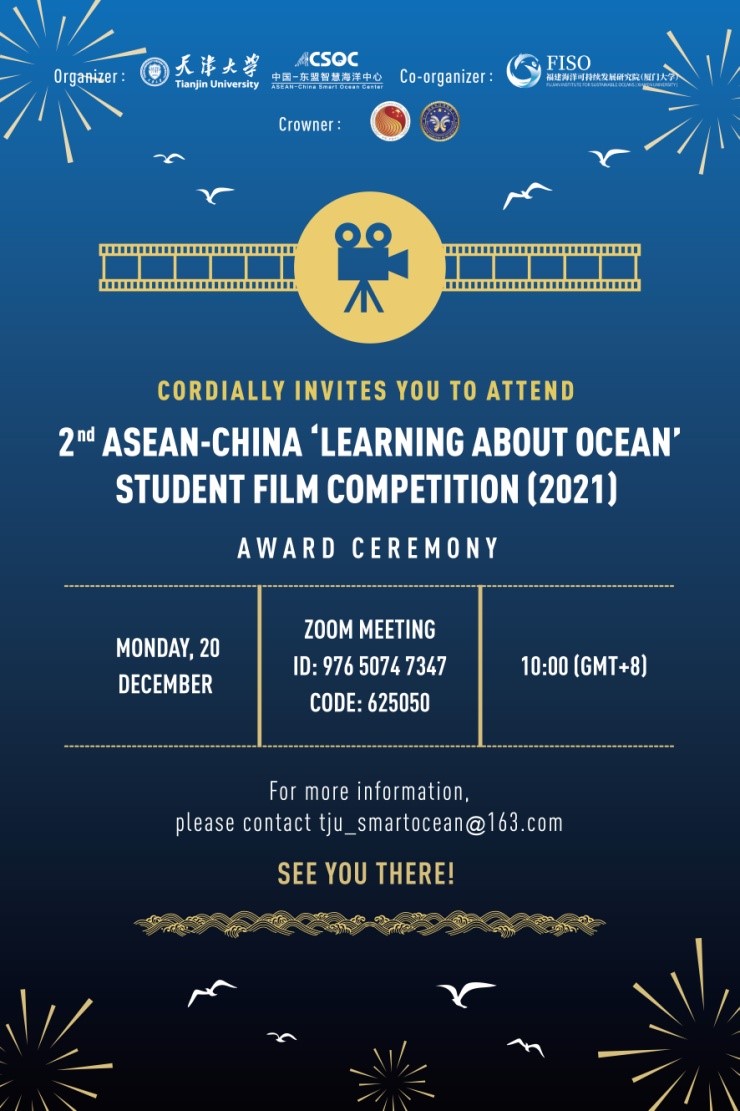 为表彰在本次2021中国-东盟“向海而学”学生视频大赛中取得优异成绩的各参赛队伍,增进中国-东盟高校间的友谊,提升海洋科普热情,加强两地人文交流。根据中国-东盟智慧海洋中心工作流程和既定时间安排,组委会将于2021年12月20日(周一)上午10时(北京时间),线上举办2021中国-东盟“向海而学”学生视频总结汇报会暨颁奖典礼。现将有关安排通知如下: