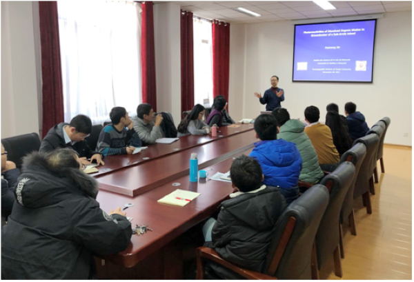 谢会祥教授从自然水体的光吸收原理以及水体中有色溶解有机物(CDOM)的光谱特征谈起,深入浅出地为大家讲解了加拿大亚北极岛地下水的光化学性质、源汇问题。同时,谢会祥教授提出了古土壤层的概念,并阐述了其对入海地下水DOM的影响。谢教授指出地下水中DOM在海岸带陆海之间地再循环系统与海平面上升、气候变暖息息相关,其研究对于全球碳循环以及气候变化具有重要的意义。谢会祥教授的学术报告让参会师生对全球碳循环有了进一步的认识,为今后的学习与如何开展研究提供了更多信息和思路。