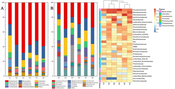 课题组采用16S rRNA测序对于河口潮间带沉积物的细菌群落结构和组成进行了检测。研究发现,在淡海水交汇环境中,淡水、河口和近岸海域沉积物细菌群落组成差别较大,盐度、陆源径流输入、pH、温度、总磷影响了河口沉积物的细菌群落分布。