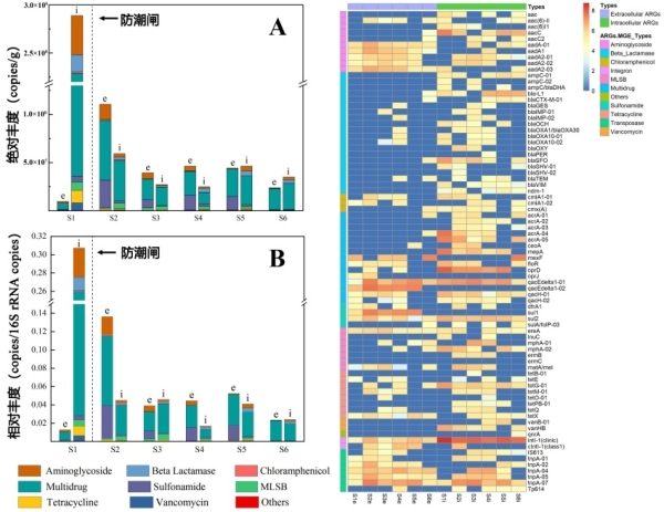 对于海河河口及近岸海域潮间带沉积物ARGs的污染问题,课题组采用HT-qPCR的方法检测近百种ARGs的存在情况和丰度水平。研究发现,海河河口沉积物中ARGs的检出率和丰度较高,表明河口沉积物是胞外和胞内ARGs重要的储存库。多药耐药类、万古霉素类、碳青霉烯类ARGs的丰度较高,可能会对人体健康造成威胁,需要引起我们的重视。河口淡海水交汇环境和陆源污染的输入对于胞外和胞内ARGs分布和传播的影响较为显著。