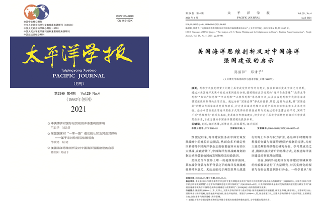 据悉,《太平洋学报》是由中国太平洋学会主办的海洋社科领域顶级期刊,是中文人文社会科学引文数据库来源期刊(CSSCI)、中国人文社会科学核心期刊、中国人民大学复印报刊资料重要转载来源期刊、中国政法类核心期刊。近年来期刊影响力不断提升,成为海洋社科研究最为重要的学术平台。