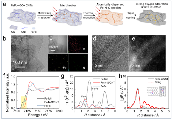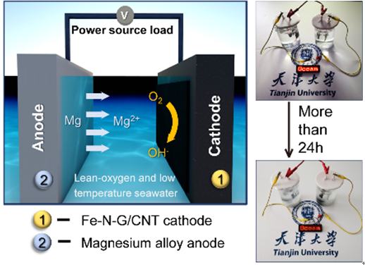 面对上述问题,他们通过微波合成法超快制备Fe-N-G/CNT单原子催化剂,实验结果结合理论计算证明了不同纳米碳界面之间的电荷分离现象及亲氧界面的存在,并阐明了其在贫氧环境下实现高效氧还原催化的机理。将其应用于海水电池,在0.4 mg·L-1的超低氧含量下,采用Fe-N-G/CNT催化正极的海水电池仍然可以正常工作而传统Pt/C催化剂则无响应,证明了亲氧催化剂在极端环境中的关键作用。