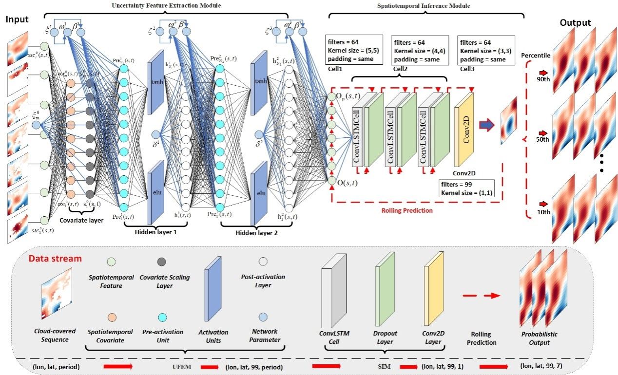 图 2. BF-CNet的概率化架构与数据流传递示意图。不同颜色用于区分结构组件:圆形表示的不确定性特征提取模块(UFEM),方形表示时空推断模块(SIM)。箭头表示数据的顺序流动:经过预处理的输入首先进入UFEM,提取99个分位上的概率特征;随后这些特征被传递至SIM进行时空推断;最终通过滚动预测扩展,生成多日尺度的概率预测结果。