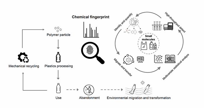 As the movement and transformation of (micro)plastics in material flow and the environment are often accompanied by changes in their macroscopic morphology and surface characteristics, it is challenging to fully understand the migration and transformation processes of (micro)plastics on a macroscopic level, increasing the difficulty of managing plastics and plastic additives. Building on previous research, the team proposed the concept of the "chemical fingerprint" of plastics, defining the characteristics (types, concentrations, and ratios) of organic small molecules related to plastics as the chemical fingerprint of plastics. This study discusses strategies and challenges for tracking plastics based on this concept. It emphasizes that the chemical fingerprint, as a unique and distinctive identifier, provides potential opportunities for tracking the entire life cycle of plastics, including processing, use, recycling, disposal, and environmental aging.